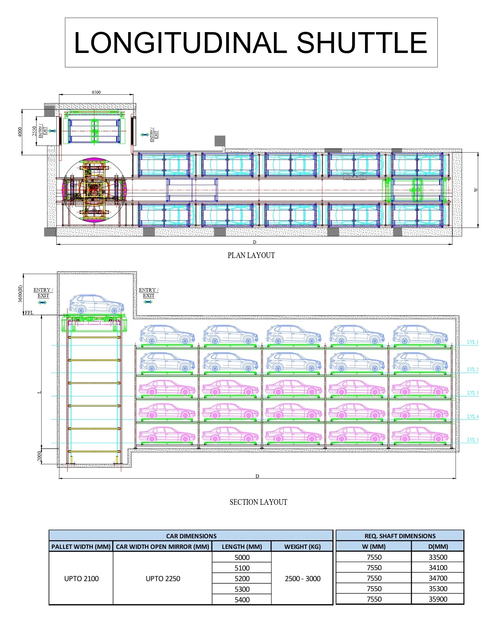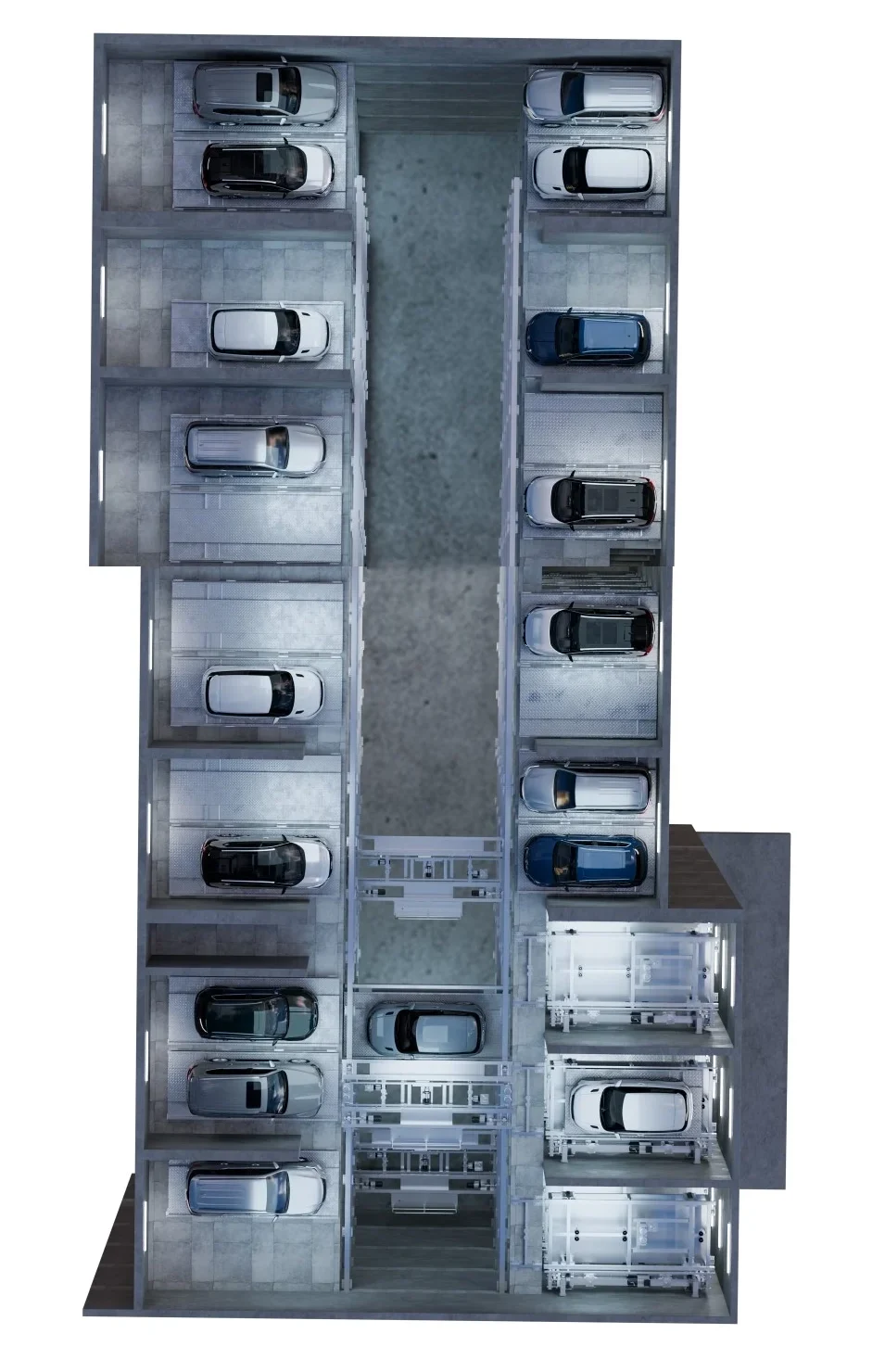 Depending on the layout, Skyzone can handle 8–42 cars, with extensions up to 2–5 levels and 3–8 grids for larger projects.
