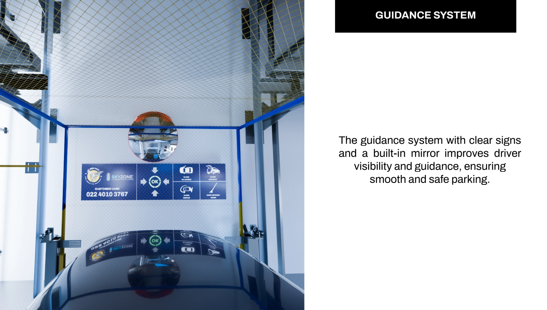 Skyzone Tower Parking is an advanced automated system that utilizes vertical space to maximize car capacity with heights up to 90 meters. Designed for above-ground, below-ground, or hybrid installations, it is compatible with RCC, steel, or mixed structures. Equipped with smart touchscreen controls, RFID access, vehicle profile checking, and integrated safety features, Skyzone ensures a safe, efficient, and future-ready parking experience.